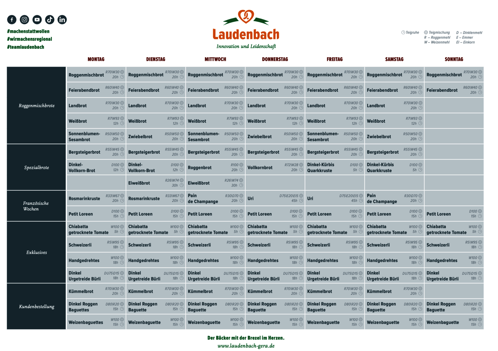 Der Beruf des Bäckers ist einer der ältesten Handwerksberufe in unserem Land. Es macht uns jeden Tag aufs Neue stolz, ein Teil dieser Historie zu sein, unser handwerkliches Können zu zeigen und mit innovativen Ideen unsere Kunden zu verwöhnen. Die Beständigkeit als Unternehmen und die Wertschätzung durch unsere Kunden erreichen wir nicht nebenbei. Dafür geben alle Mitarbeiter in der Bäckerei & Konditorei Laudenbach ihr Bestes. Ganz gleich, ob in der Produktion, im Verkauf, in der Disposition oder im Büro – alle sind gleich wichtig und tragen miteinander Verantwortung.