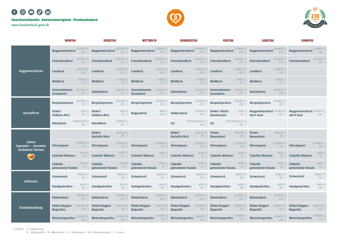 Bei Laudenbach bekommt jeder das Brot, was ihm schmeckt. Kartoffelbrot und Roggenbrot für den herzhaften Typ. Weißbrot und Baguette für die Liebhaber von hellen Broten, Dinkelbrot für Jung und Alt und natürlich unser glutenfreies Brot. Kerniges Vollkornbrot ist das Lieblingsbrot vieler unserer Kunden. Für alle Fitnessbegeisterten haben wir Low Carb Brötchen im Sortiment. Gutes Brot muss außen knusprig sein mit einer schönen Krume. Es muss innen saftig sein. Und natürlich schmeckt gutes Brot auch ohne Belag. Ach ja, und es duftet herrlich von mild bis würzig. Wir haben das Glück, daß wir diesen Duft jeden Tag in unserer Backstube genießen dürfen.